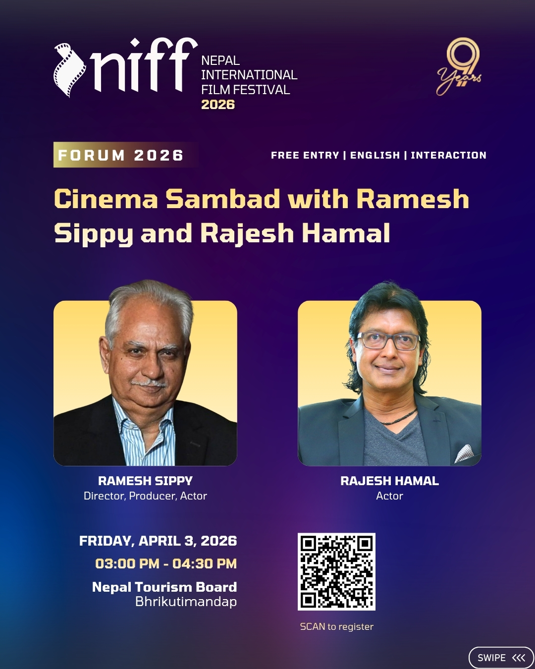 उनले भने, ‘दुई लेजेन्डहरूको अनुभव, उनीहरूको भोगाइ र सिनेमाको भविष्यका विषयमा उहाँहरूले संवाद गर्ने तय भएको हो । निफमा लिजेन्ड निर्देशक सिप्पीको उपस्थितिले बलिउड उद्योग र नेपाली चलचित्र क्षेत्रको सम्बन्ध थप विस्तार हुने अपेक्षाले यो कार्यक्रम राखिएको हो ।’